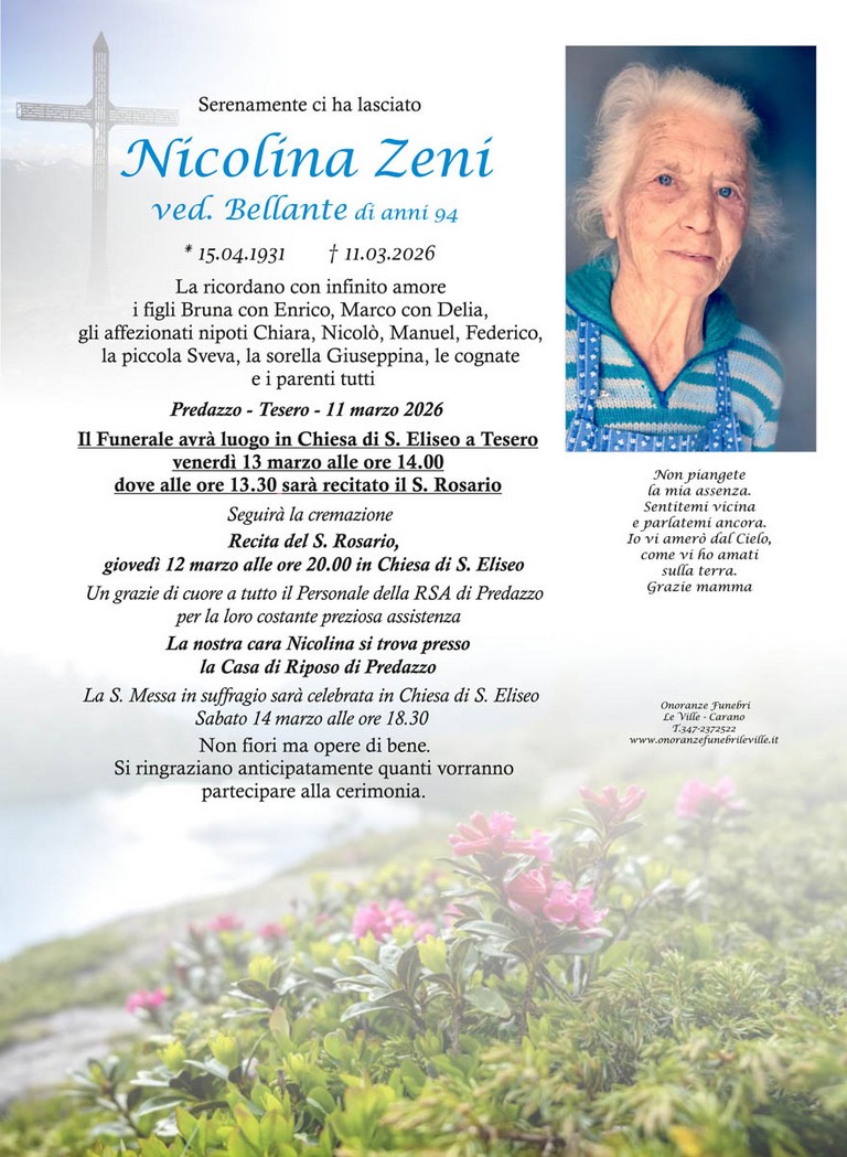 E' mancata Nicolina Zeni vedova Bellante, 94 anni, di Tesero - Fiemme e Fassa - utilità, eventi, cinema, notizie