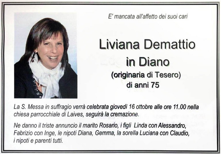 E' mancata Liviana Demattio in Diano, 75 anni, di Tesero - Laives (BZ) - Fiemme e Fassa - utilità, eventi, cinema, notizie