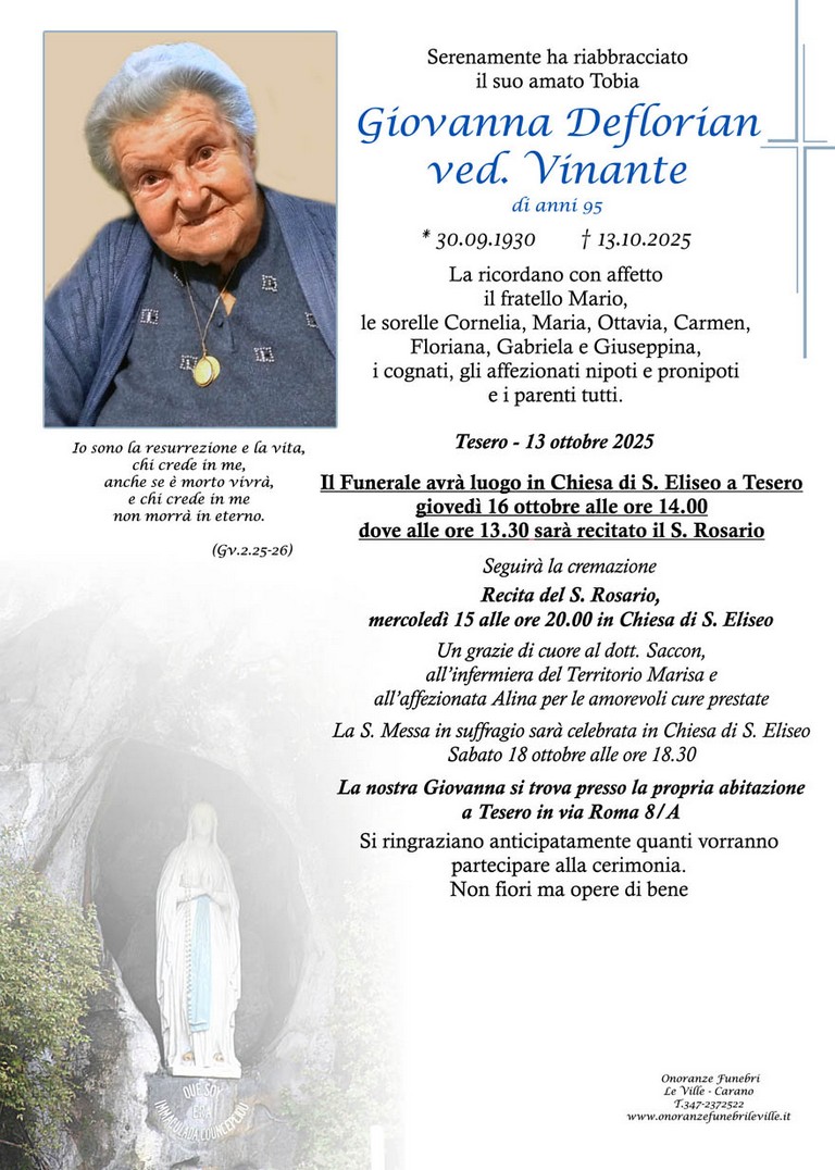 E' mancata Giovanna Deflorian vedova Vinante, 95 anni, di Tesero - Fiemme e Fassa - utilità, eventi, cinema, notizie