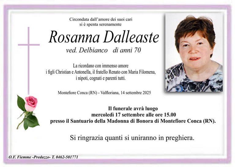 E' mancata Rosanna Dalleaste vedova Delbianco, 70 anni, di Valfloriana - Fiemme e Fassa - utilità, eventi, cinema, notizie