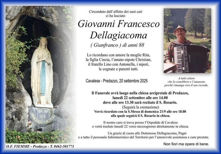 E' mancato Giovanni Francesco Dellagiacoma (Gianfranco), 88 anni, di Predazzo - Fiemme e Fassa - utilità, eventi, cinema, notizie