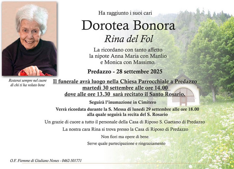 E' mancata Dorotea Bonora "Rina dal Fol" di Predazzo - Fiemme e Fassa - utilità, eventi, cinema, notizie