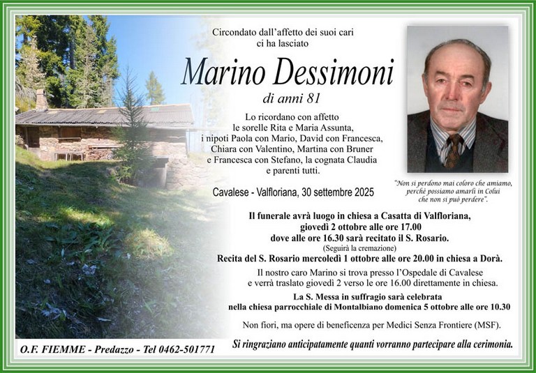 E' mancato Marino Dessimoni, 81 anni, di Valfloriana - Fiemme e Fassa - utilità, eventi, cinema, notizie