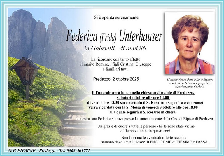 E' mancata Federica (Frida) Unterhauser in Gabrielli, 86 anni, di Predazzo - Fiemme e Fassa - utilità, eventi, cinema, notizie
