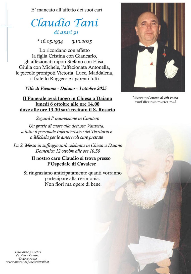 E' mancato Claudio Tani, 91 anni di Ville di Fiemme - Daiano - Fiemme e Fassa - utilità, eventi, cinema, notizie