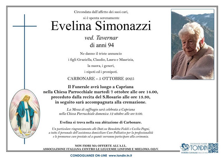 E' mancata Evelina Simonazzi vedova Tavernar, 94 anni di Carbonare di Capriana - Fiemme e Fassa - utilità, eventi, cinema, notizie