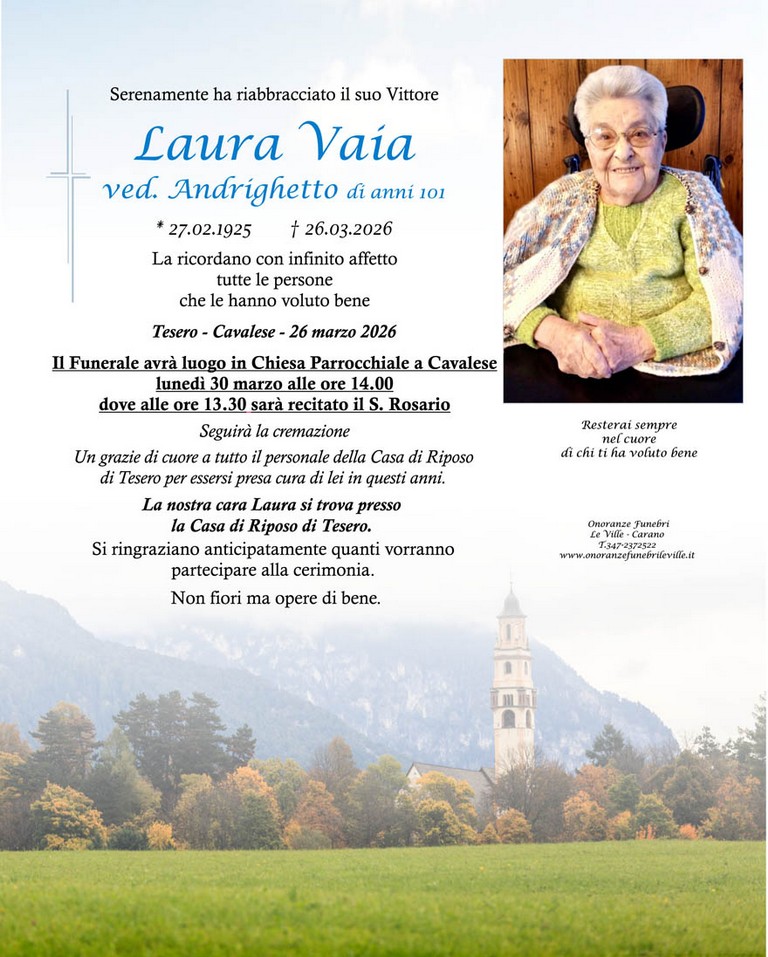 E' mancata Laura Vaia vedova Andrighetto, 101 anni, di Cavalese - Fiemme e Fassa - utilità, eventi, cinema, notizie