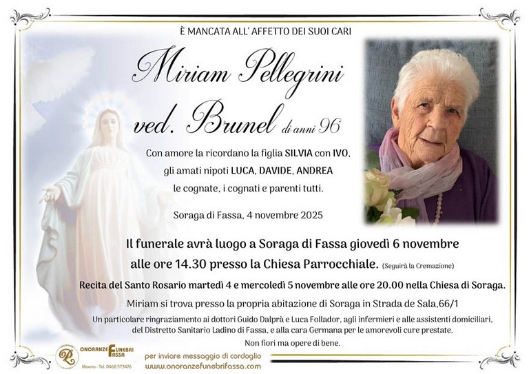 E' mancata Miriam Pellegrini vedova Brunel, 96 anni, di Soraga - Fiemme e Fassa - utilità, eventi, cinema, notizie