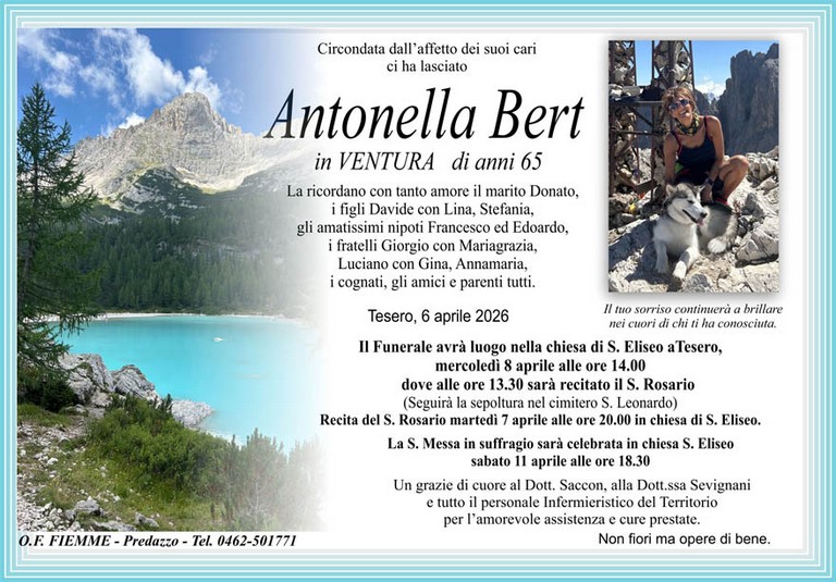 E' mancata Antonella Bert in Ventura, 65 anni, di Tesero - Fiemme e Fassa - utilità, eventi, cinema, notizie