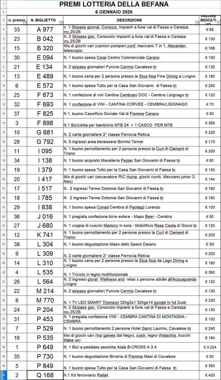 Tutto ciò grazie all’importante contributo che deriva dall’annuale lotteria al costo di € 1,00 a biglietto con estrazione prevista il 6 gennaio ore 15.00 a Cembra (TN)