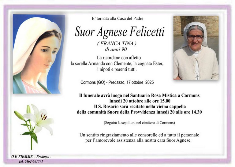 E' mancata Suor Agnese Felicetti (Franca Tina), 90 anni, di Predazzo - Fiemme e Fassa - utilità, eventi, cinema, notizie