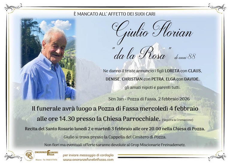 E' mancato Giulio Florian "da la Rosa", 88 anni, di Sèn Jan - Pozza di Fassa - Fiemme e Fassa - utilità, eventi, cinema, notizie