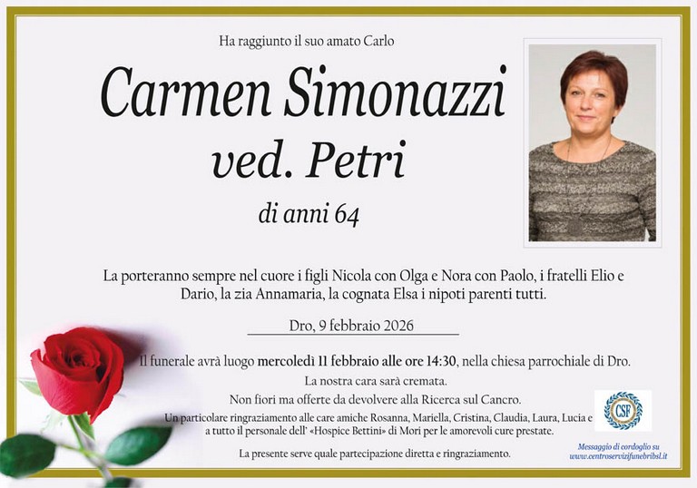 E' mancata Carmen Simonazzi vedova Pedri, 64 anni, di Capriana - Dro - Fiemme e Fassa - utilità, eventi, cinema, notizie