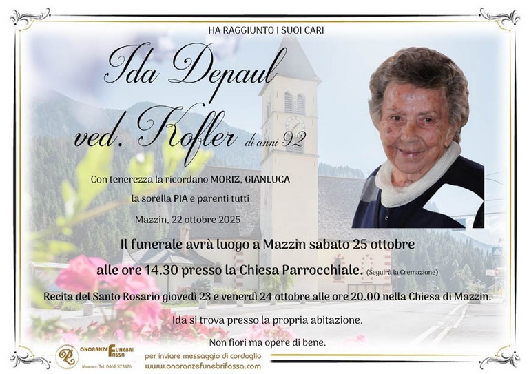 E' mancata Ida Depaul vedova Kofler, 92 anni, di Mazzin - Fiemme e Fassa - utilità, eventi, cinema, notizie