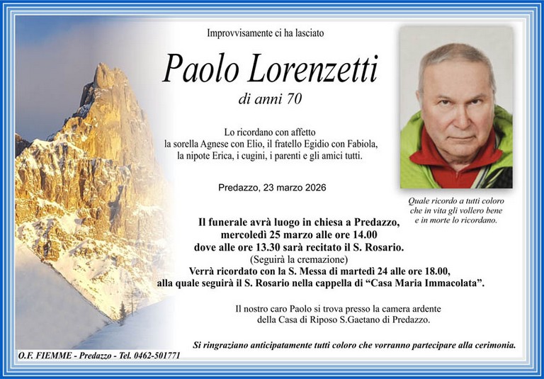 E' mancato Paolo Lorenzetti, 70 anni, di Predazzo - Fiemme e Fassa - utilità, eventi, cinema, notizie