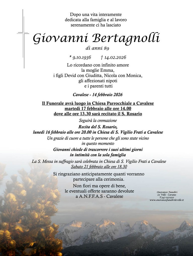 E' mancato Giovanni Bertagnolli, 89 anni, di Cavalese - Fiemme e Fassa - utilità, eventi, cinema, notizie