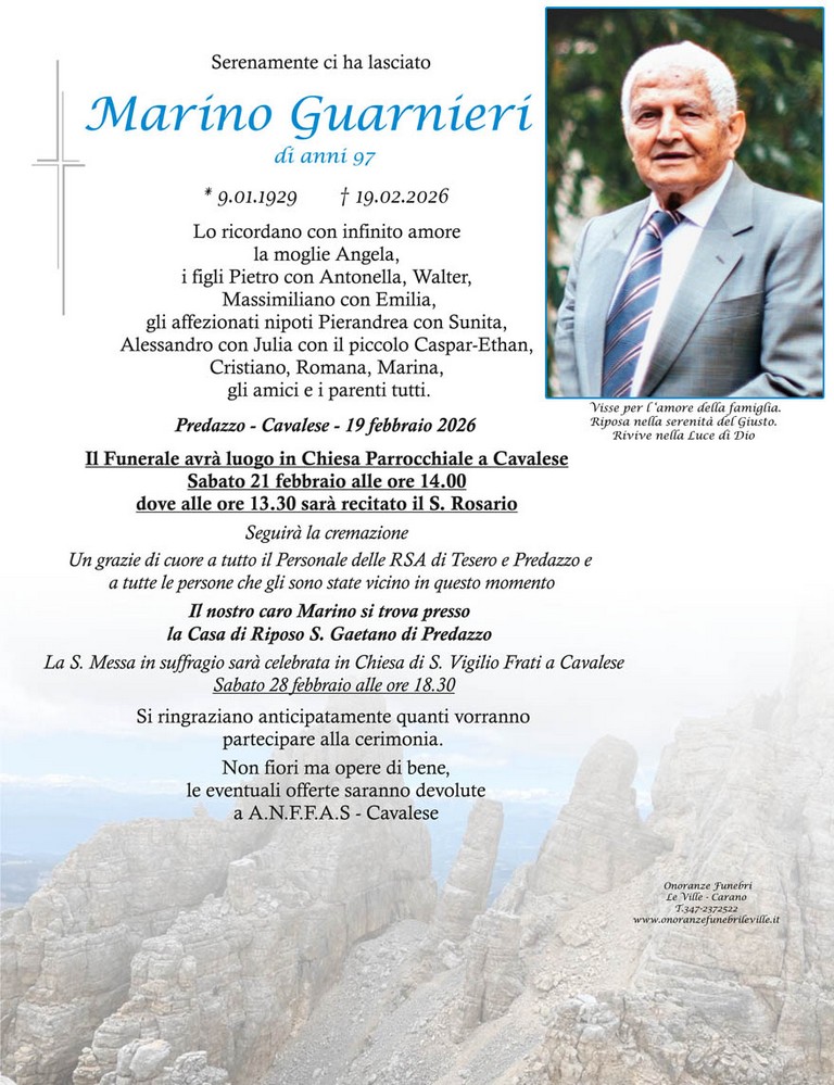 E' mancato Marino Guarnieri, 97 anni, di Cavalese - Fiemme e Fassa - utilità, eventi, cinema, notizie
