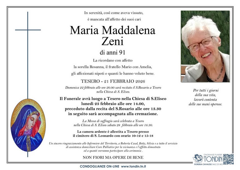 E' mancata Maria Maddalena Zeni, 91 anni, di Tesero - Fiemme e Fassa - utilità, eventi, cinema, notizie