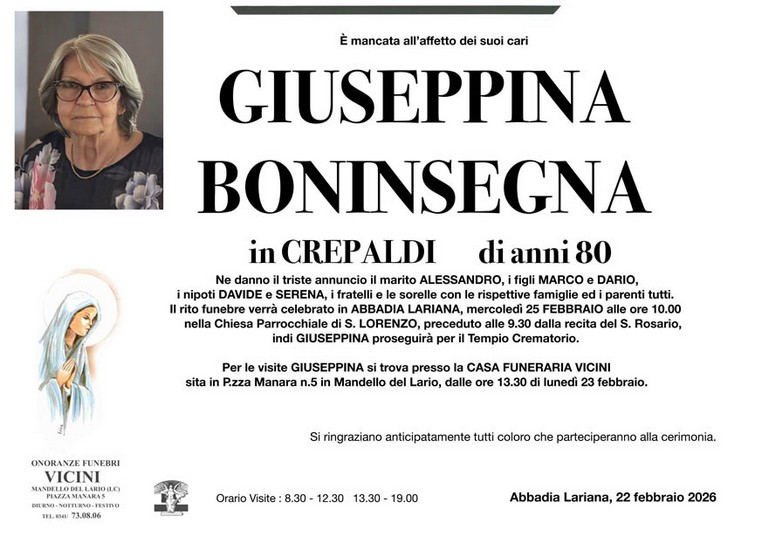 E' mancata Giuseppina Boninsegna in Crepaldi, 80 anni, di Predazzo - Abbadia Lariana (LC) - Fiemme e Fassa - utilità, eventi, cinema, notizie