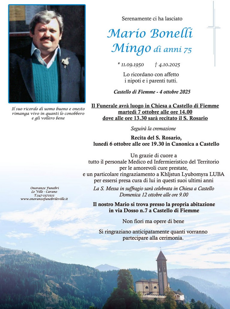 E' mancato Mario Bonelli "Mingo", 75 anni, di Castello di Fiemme - Fiemme e Fassa - utilità, eventi, cinema, notizie