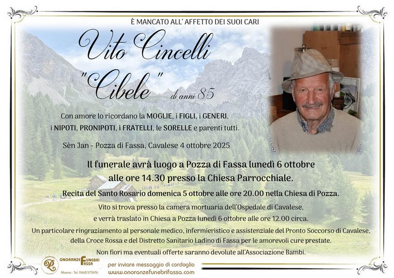 E' mancato Vito Cincelli "Cibele", 85 anni, di Sèn Jan - Pozza di Fassa - Fiemme e Fassa - utilità, eventi, cinema, notizie