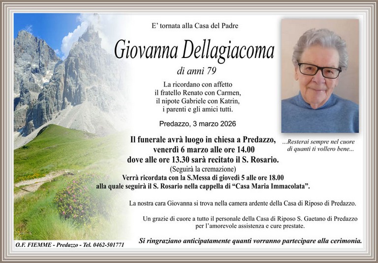 E' mancata Giovanna Dellagiacoma, 79 anni, di Predazzo - Fiemme e Fassa - utilità, eventi, cinema, notizie