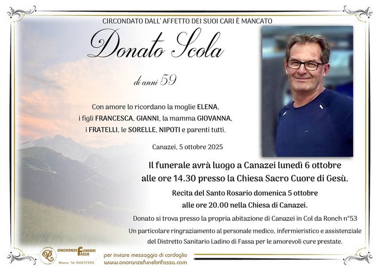 E' mancato Donato Scola, 59 anni, di Canazei - Fiemme e Fassa - utilità, eventi, cinema, notizie