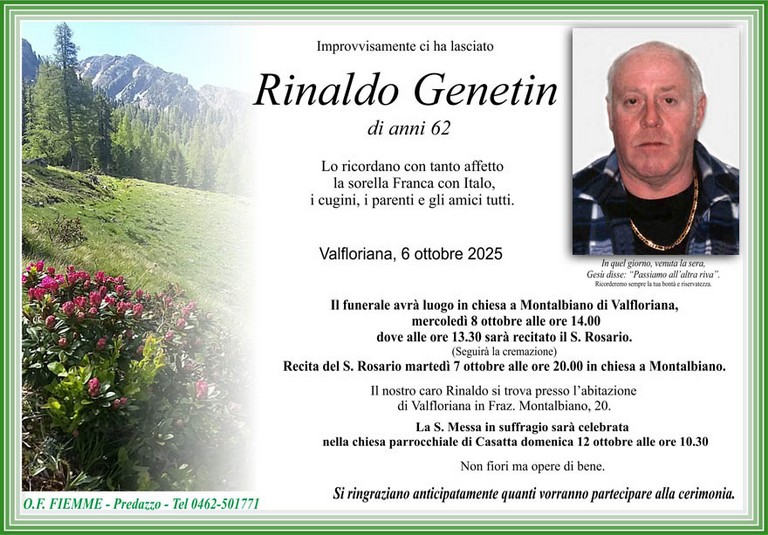 E' mancato Rinaldo Genetin, 62 anni, di Valfloriana - Fiemme e Fassa - utilità, eventi, cinema, notizie