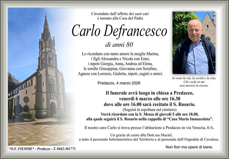 E' mancato Carlo Defrancesco, 80 anni, di Predazzo - Fiemme e Fassa - utilità, eventi, cinema, notizie