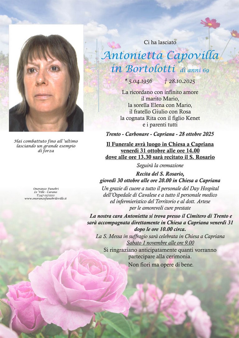 E' mancata Antonietta Capovilla in Bortolotti, 69 anni, di Carbonare - Capriana - Fiemme e Fassa - utilità, eventi, cinema, notizie