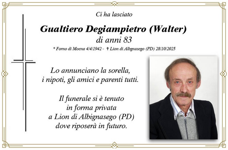 E' mancato Gualtiero Degiampietro (Walter), 83 anni, di Forno di Moena - Fiemme e Fassa - utilità, eventi, cinema, notizie