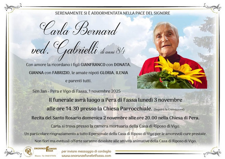 E' mancata Carla Bernard vedova Gabrielli, 84 anni, di Sèn Jan - Pera di Fassa - Fiemme e Fassa - utilità, eventi, cinema, notizie