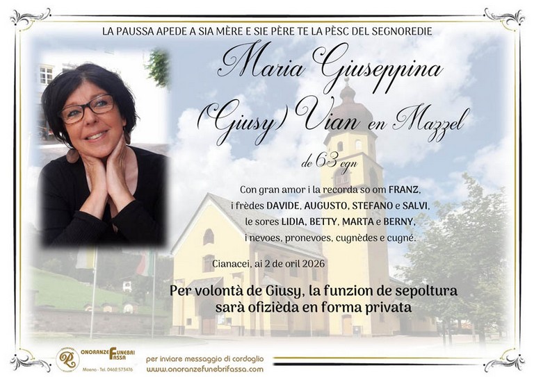 E' mancata Maria Giuseppina (Giusy) Vian in Mazzel, 63 anni, di Canazei - Fiemme e Fassa - utilità, eventi, cinema, notizie