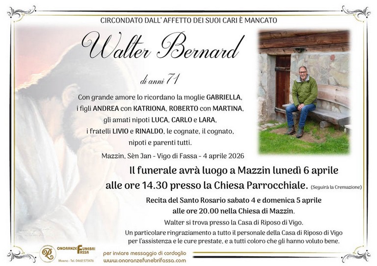 E' mancato Walter Bernard, 71 anni, di Mazzin - Fiemme e Fassa - utilità, eventi, cinema, notizie