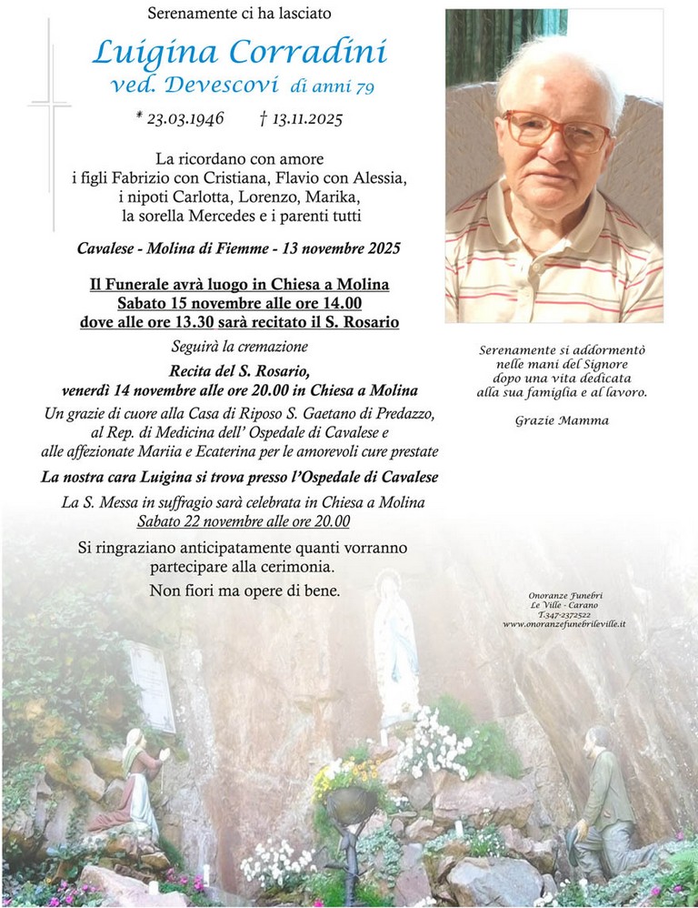 E' mancata Luigina Corradini vedova Devescovi, 79 anni, di Molina di Fiemme - Fiemme e Fassa - utilità, eventi, cinema, notizie