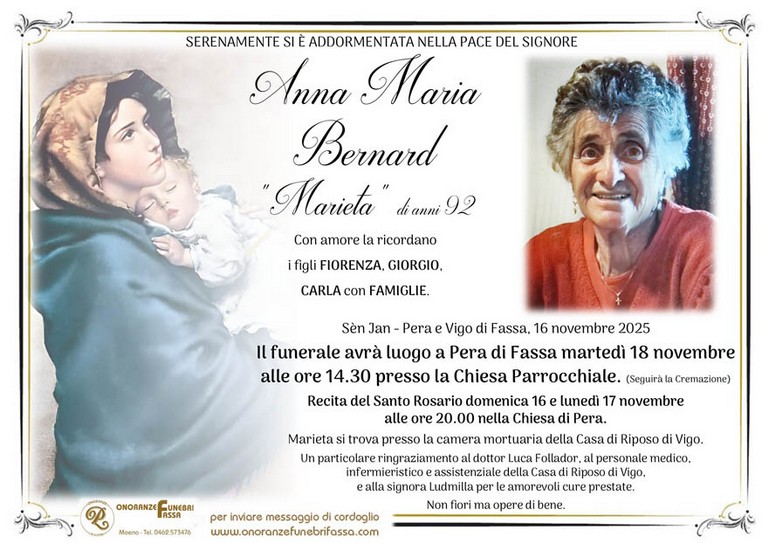 E' mancata Anna Maria Bernard "Marieta", 92 anni, di Sèn Jan - Pera di Fassa - Fiemme e Fassa - utilità, eventi, cinema, notizie