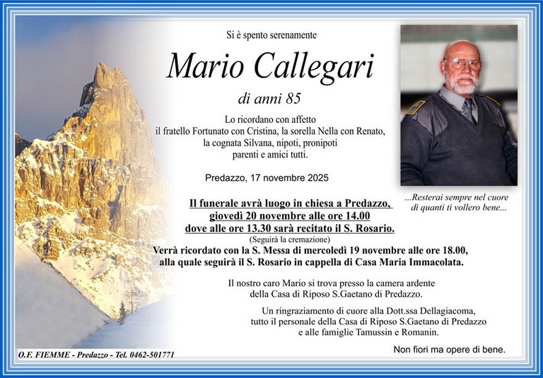 E' mancato Mario Callegari, 85 anni, di Predazzo - Fiemme e Fassa - utilità, eventi, cinema, notizie