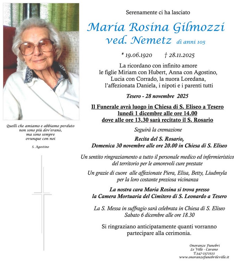 E' mancata Maria Rosina Gilmozzi vedova Nemetz, 105 anni, di Tesero - Fiemme e Fassa - utilità, eventi, cinema, notizie