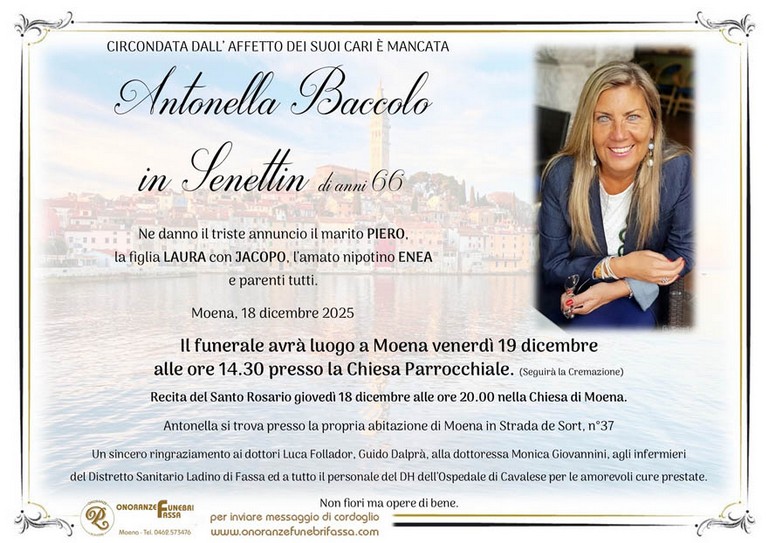E' mancata Antonella Baccolo in Senettin, 66 anni, di Moena - Fiemme e Fassa - utilità, eventi, cinema, notizie