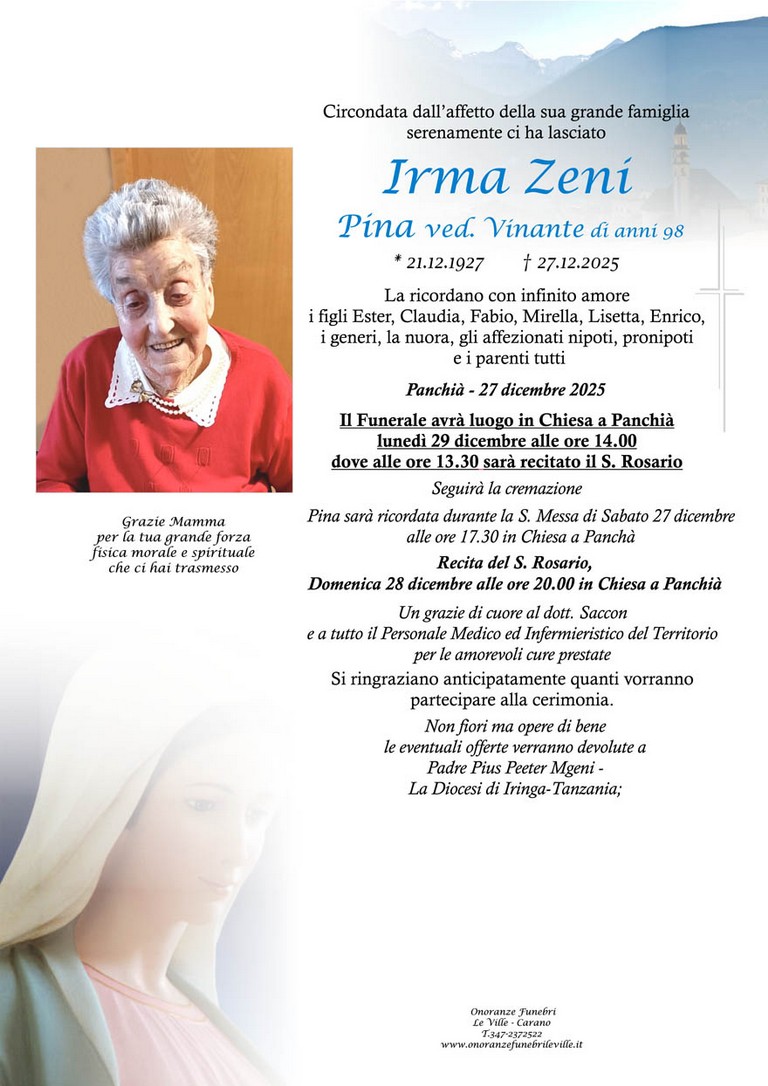 E' mancata Irma Zeni "Pina" vedova Vinante, 98 anni, di Panchià - Fiemme e Fassa - utilità, eventi, cinema, notizie