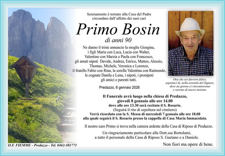 E' mancato Primo Bosin, 90 anni, di Predazzo - Fiemme e Fassa - utilità, eventi, cinema, notizie