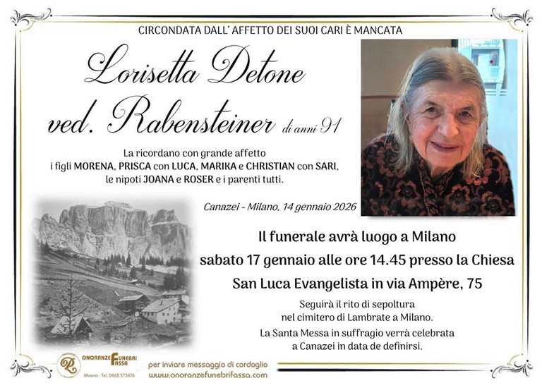 E' mancata Lorisetta Detone vedova Rabensteiner, 91 anni, di Canazei - Milano - Fiemme e Fassa - utilità, eventi, cinema, notizie