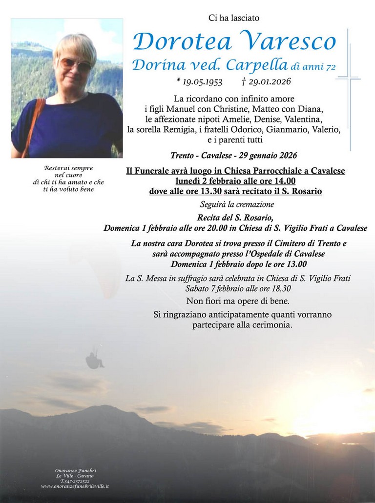 E' mancata Dorotea Varesco "Dorina" vedova Carpella, 72 anni, di Cavalese - Fiemme e Fassa - utilità, eventi, cinema, notizie