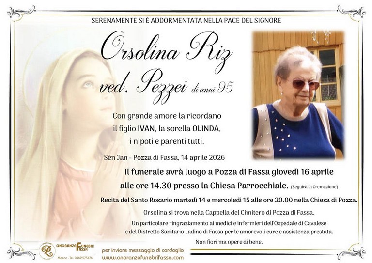 E' mancata Orsolina Riz vedova Pezzei, 95 anni, di Sèn Jan - Pozza di Fassa - Fiemme e Fassa - utilità, eventi, cinema, notizie