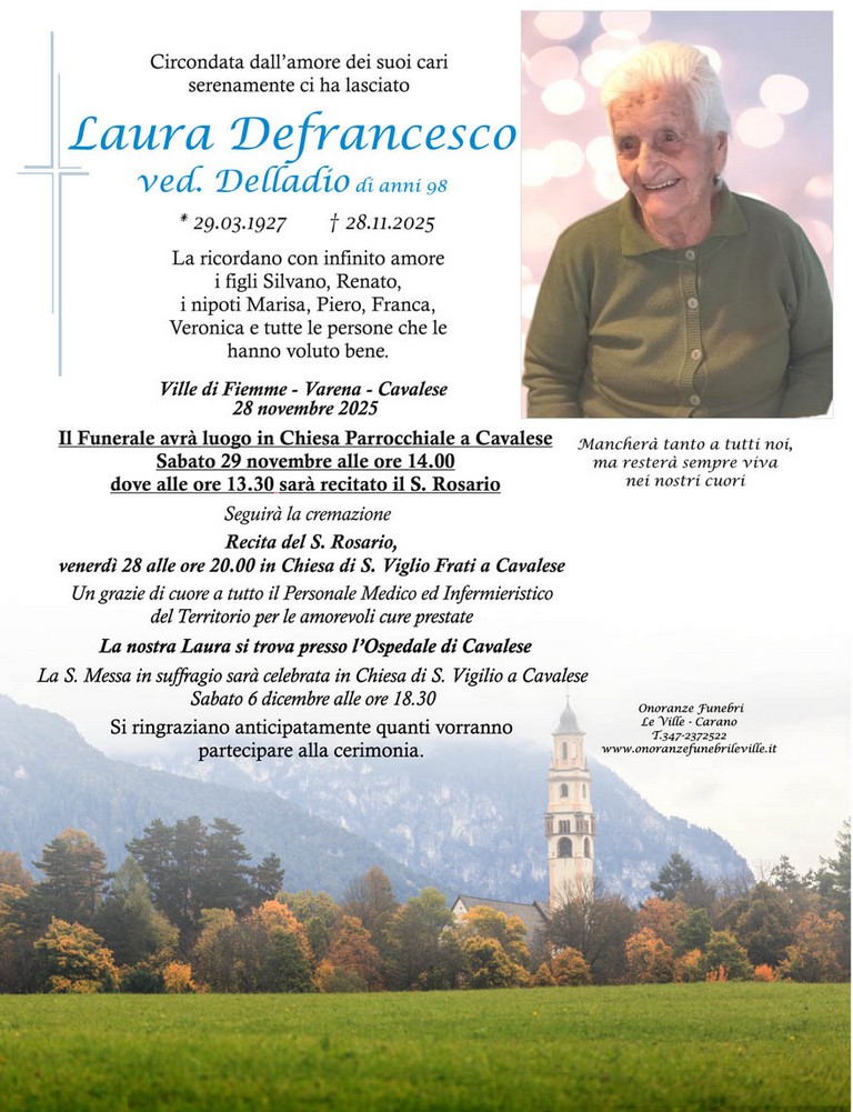 E' mancata Laura Defrancesco vedova Delladio, 98 anni, di Cavalese - Varena - Fiemme e Fassa - utilità, eventi, cinema, notizie