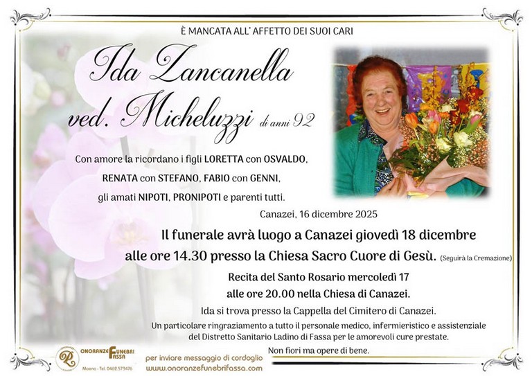 E' mancata Ida Zancanella vedova Micheluzzi, 92 anni, di Canazei - Fiemme e Fassa - utilità, eventi, cinema, notizie