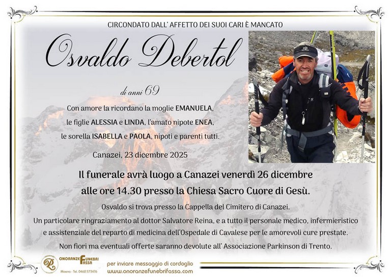 E' mancato Osvaldo Debertol, 69 anni, di Canazei - Fiemme e Fassa - utilità, eventi, cinema, notizie
