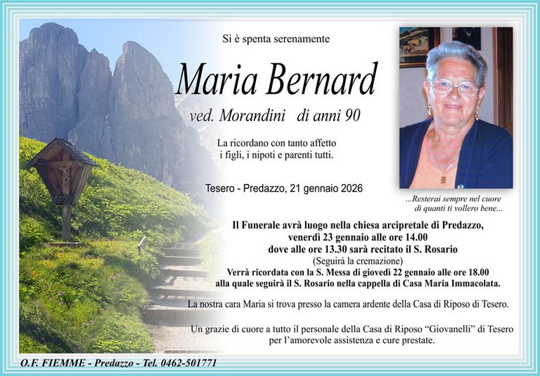 E' mancata Maria Bernard vedova Morandini, 90 anni, di Predazzo - Fiemme e Fassa - utilità, eventi, cinema, notizie