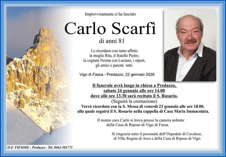 E' mancato Carlo Scarfì, 81 anni, di Predazzo - Fiemme e Fassa - utilità, eventi, cinema, notizie