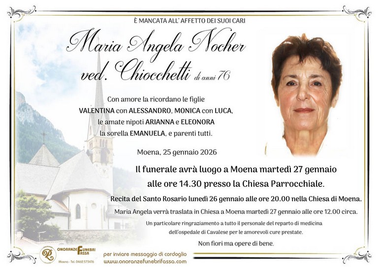 E' mancata Maria Angela Nocher vedova Chiocchetti, 76 anni, di Moena - Fiemme e Fassa - utilità, eventi, cinema, notizie